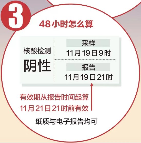 那么,48小时内核酸检测阴性证明有效期从报告时间起算,11月21日21时前有效。