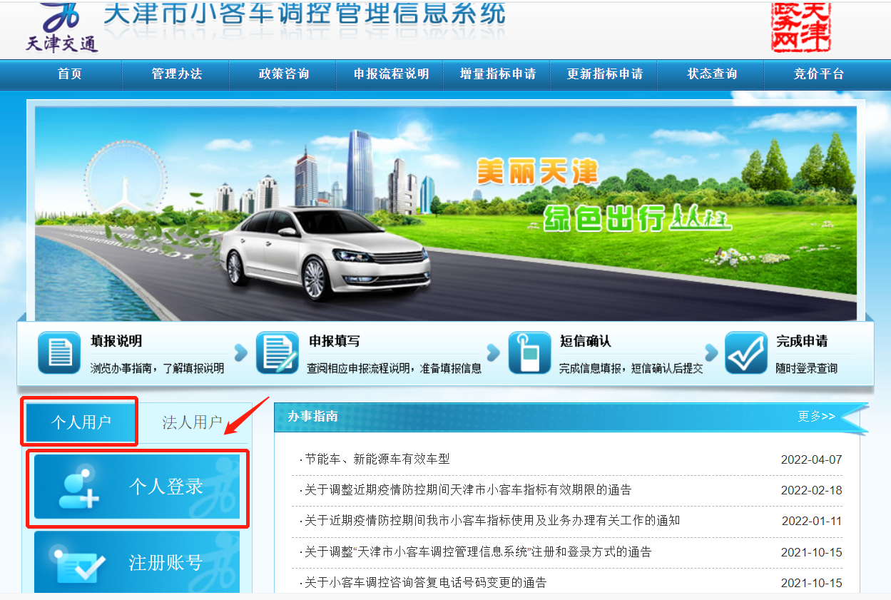 登录天津市小客车调控管理信息系统网站:http://xkctk.jtys.tj.gov.cn