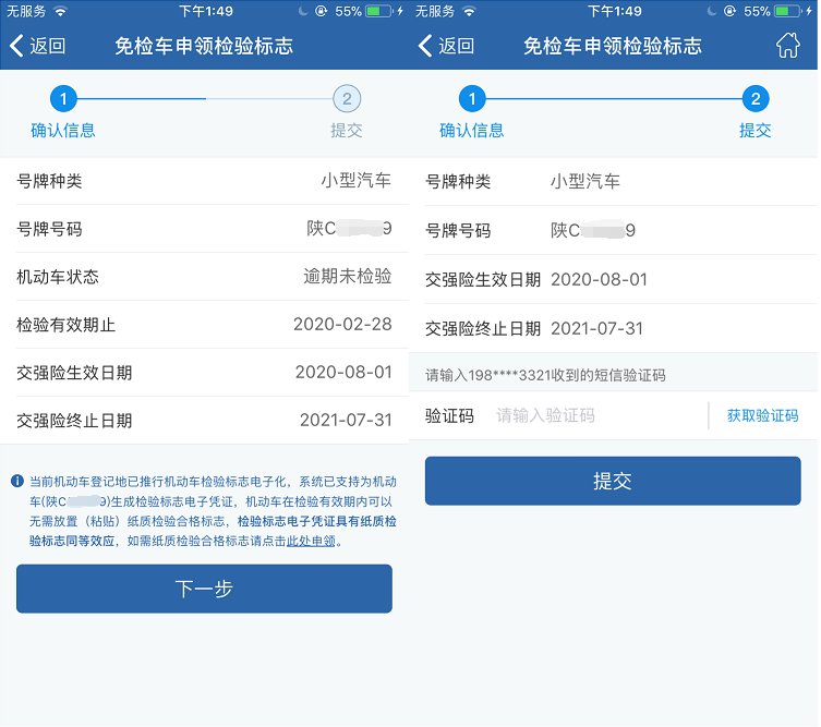 交强险和车船税联网核查通过:确认车辆信息页面,包括号牌种类、号牌号码、机动车状态、检验有效期止、交强险生效日期、交强险终止日期信息,点击【下一步】进入信息确认提交页面,用户再次核对免检车申领检验标志申请信息,待确认所填资料信息无误后,获取手机短信验证码,核验通过后,点击【提交】按钮,完成免检车申领检验标志业务申请信息提交。