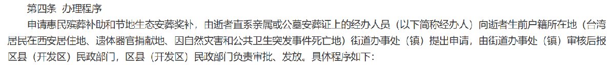 街道办事处(镇)收到申请材料后,应在5个工作日内,对申请人是否符合西安市惠民殡葬补助政策身份要求以及其他相关情况进行审核。符合条件的,在《西安市节地生态安葬奖补申请审批表》上签署意见,连同相关资料一并报区县(开发区)民政部门审批;对不符合条件的,要书面通知申请人,告知原因。