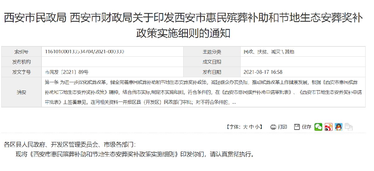 西安市民政局 西安市财政局关于印发西安市惠民殡葬补助和节地生态安葬奖补政策实施细则的通知