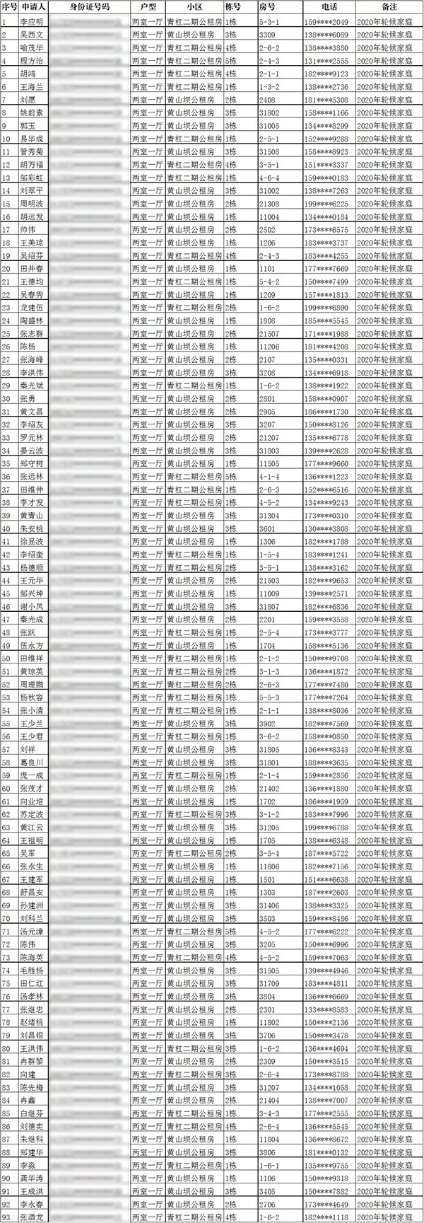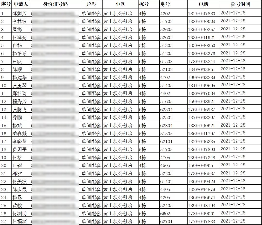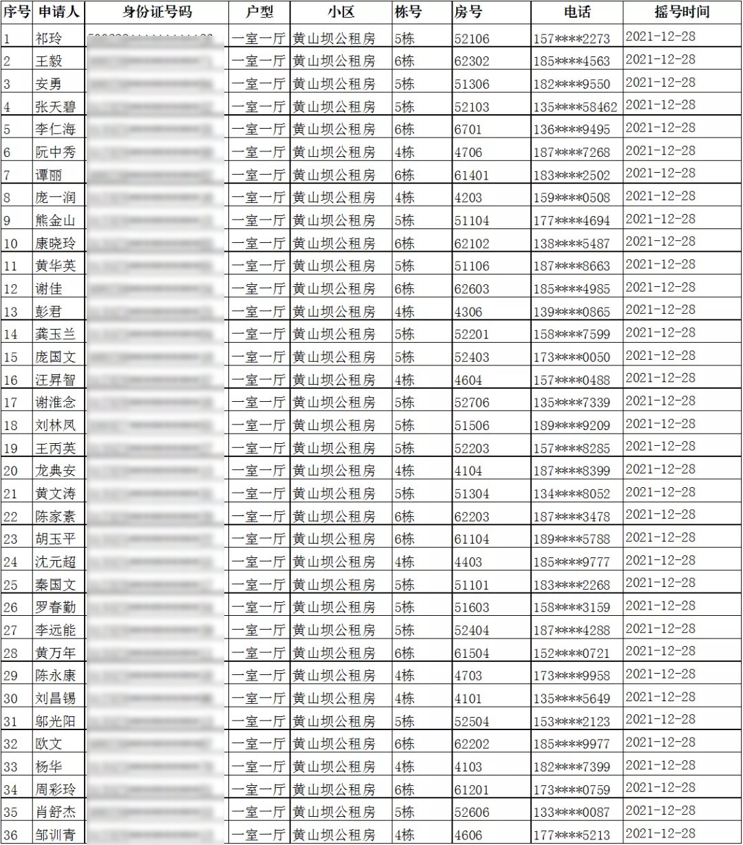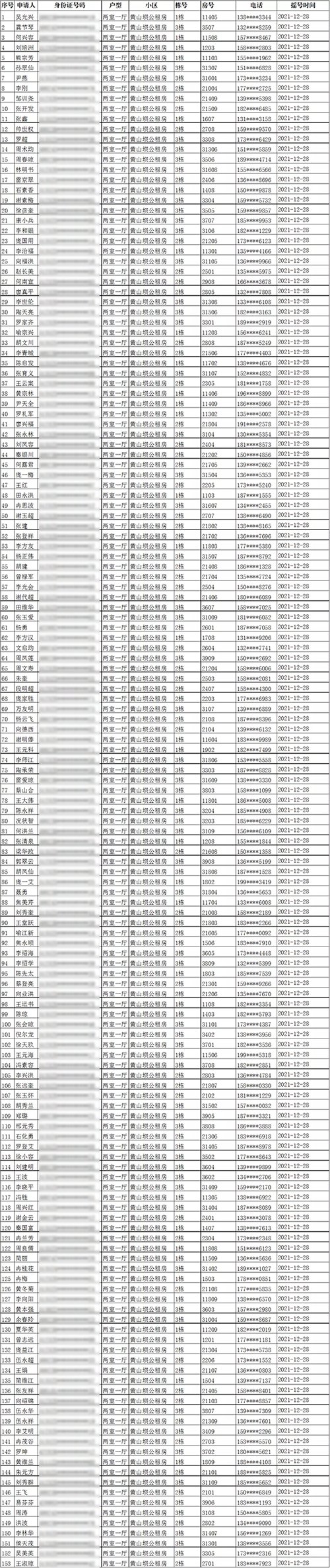二、黄山坝公租房单间配套家庭摇号结果(入住办理时间:2022年2月28日-3月4日)