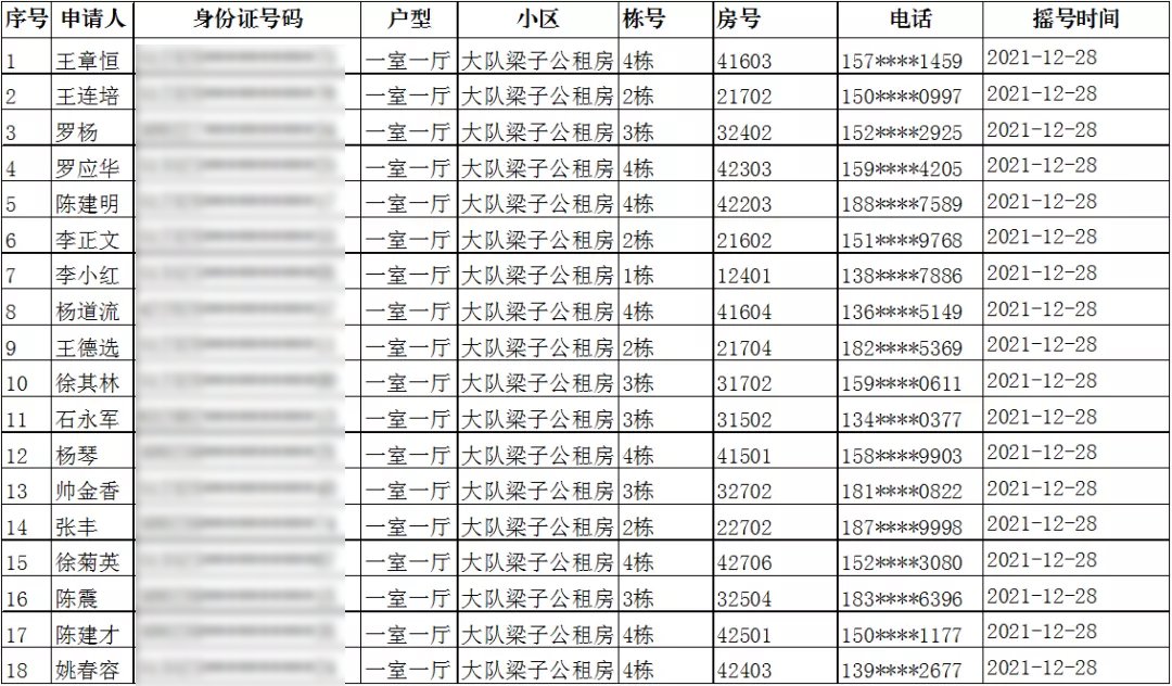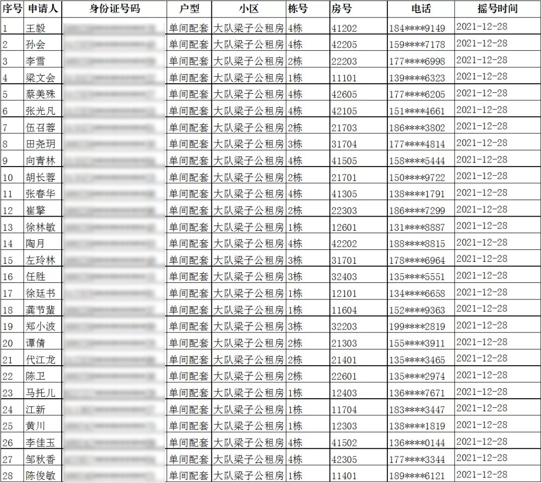 七、大队梁子公租房单间配套家庭摇号结果(入住办理时间:2022年3月21日-3月25日)