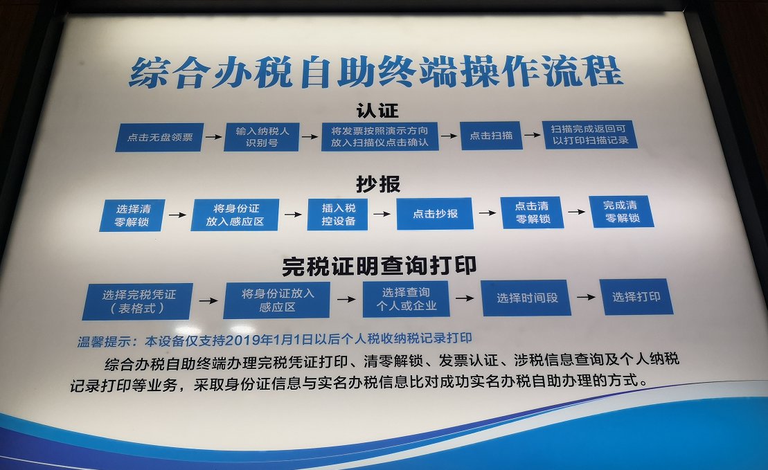 综合办税自助终端办理完税凭证打印、清零解锁、发票认证、涉税信息查询及个人纳税记录打印等业务,采取身份证信息与实名办税信息比对成功实名办税自助办理的方式。