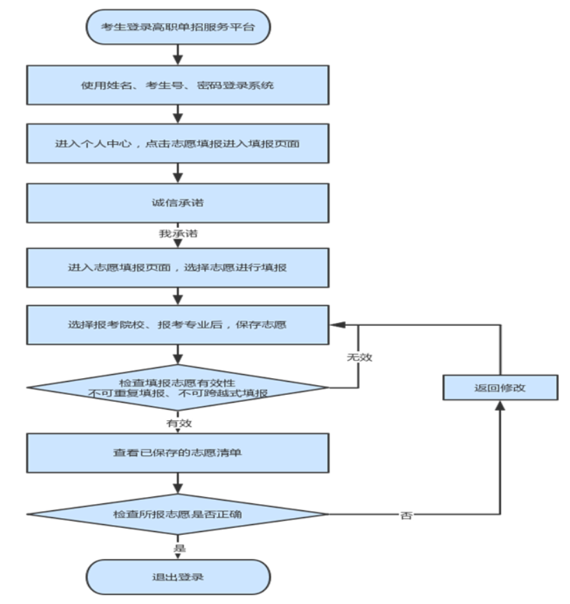 完成我省 2022 年高职单招报考的考生,方可填报志愿。 考生登录“单招平台”后,进入“个人中心”,点击“志愿填报”进入志愿填报系统。具体操作 流程如下: