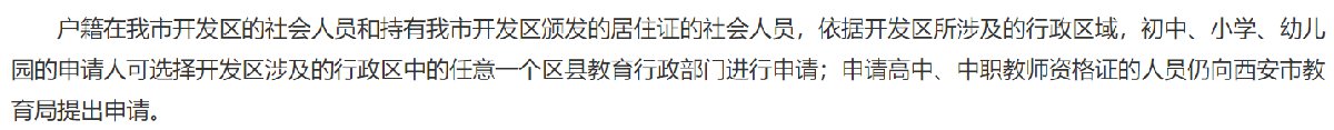 回答:户籍在西安市开发区的社会人员和持有西安市开发区颁发的居住证的社会人员申请高中、中职教师资格证的人员必须向西安市教育局提出申请。