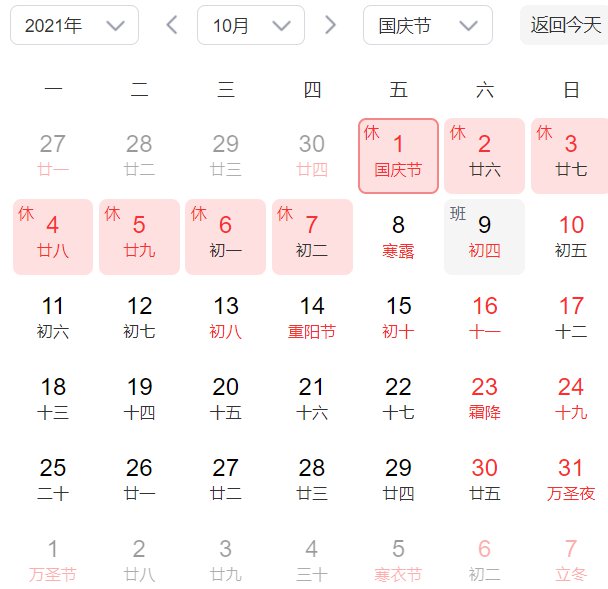根据国务院办公厅有关通知,2021年国庆假期共七天(2021年10月1日-7日)。