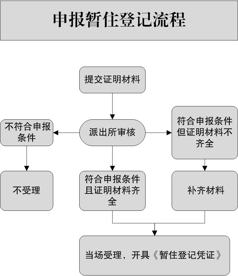 暂住登记:公民申报暂住登记,需提交本人居民身份证或者其他有效身份证明、住所证明,由社区(驻村)民警审验证明材料,对符合申报条件且证明材料齐全的,应当当场受理,向申报人免费开具《暂住登记凭证》。