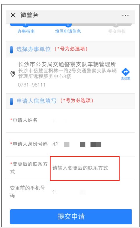 五、进行人脸识别之后,进入到业务申请页面,输入变更后的联系方式,之后点击“提交申请”。申请提交后,车管部门会对所提供的资料进行核实,核实成功后予以受理。
