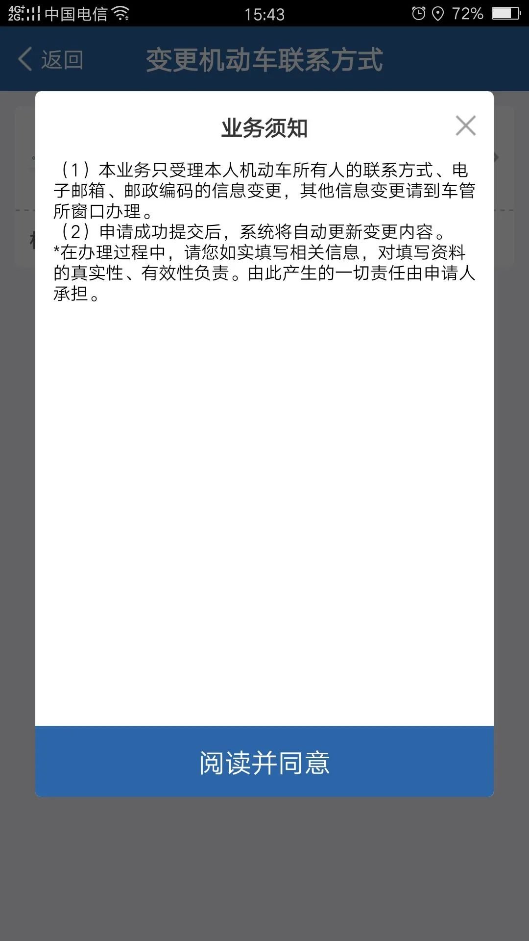 步骤二:选择更改联系方式的车辆,阅读“业务须知”点击【阅读并同意】,进入下一步。