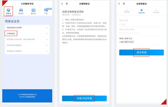 下载并注册我的长沙APP,搜索【驾驶证】,点击【驾驶证】-【注销驾驶证】,完成刷脸实人认证后,点击【同意,开始申请】,填写电话号码即可提交注销申请。