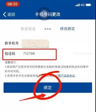 6.完成验证后,填写“新手机号”→点击“获取验证码”,填写验证码后点击“绑定”,即可完成变更驾驶证联系方式业务。