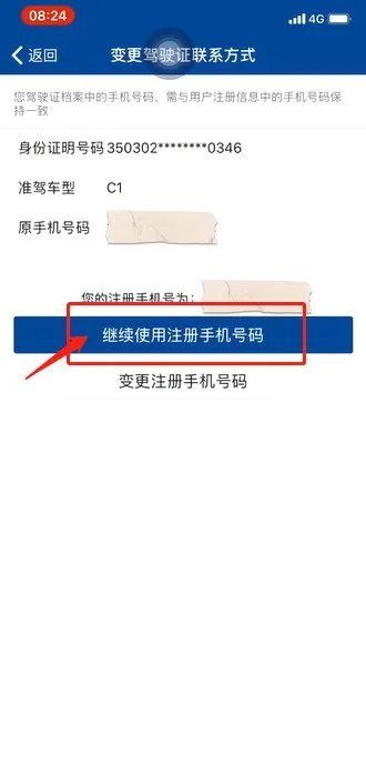4.进入变更驾驶证联系方式页面,确认身份证号码,准驾车型和原手机号。若用户注册信息中的手机号码与驾驶证档案中的手机号码一致,则选择“继续使用注册手机号码”。若用户注册信息中的手机号码与驾驶证档案中的手机号码不一致,则选择“变更注册手机号码”。