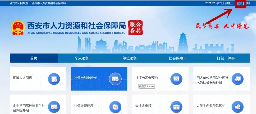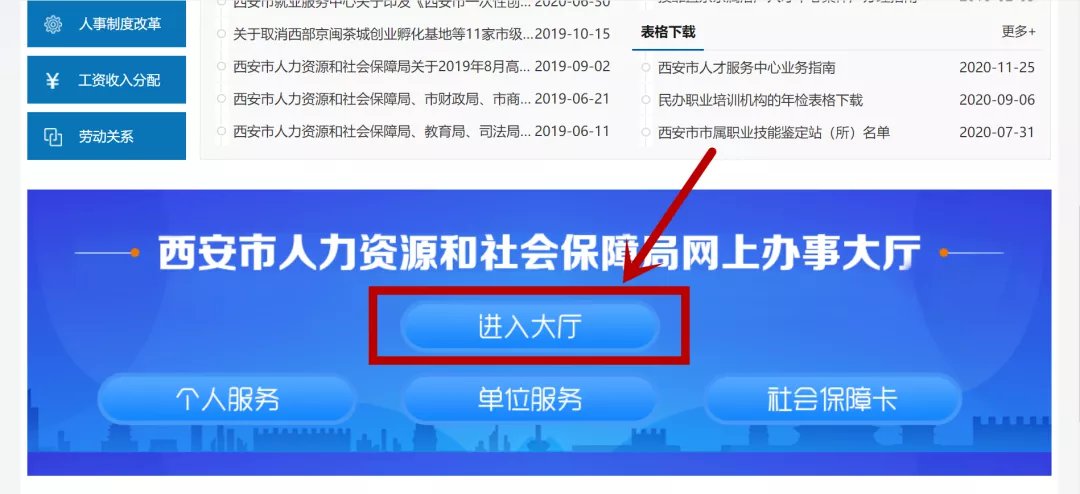 注:“西安市人力资源和社会保障局网上办事大厅”个人用户已完成与“西安政务服务网”的整合。“西安政务服务网”用户点击上方“政务网登录”进行登录,“西安市人力资源和社会保障局网上大厅”原有注册用户,点击上方“个人登录”进行登录。