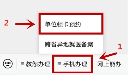 2、进入公众号,点击下方“手机办理”菜单,选择“单位领卡预约”