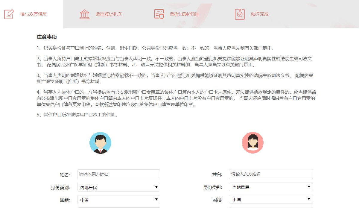 5、双方户口簿和身份证上的姓名、性别、出生日期、身份证件号应当一致;不一致的,应当先到公安部门更正;证件丢失或超过有效期的,应当到公安部门补办证件。
