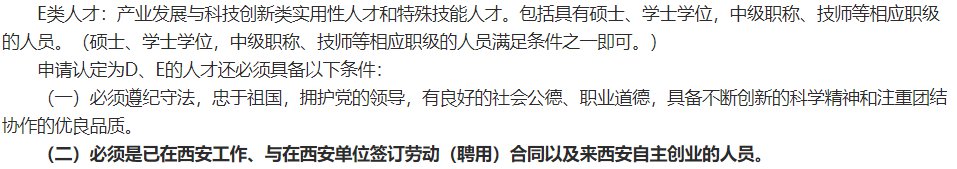 西安E类人才认定条件要求产业发展与科技创新类实用性人才和特殊技能人才。包括具有硕士、学士学位,中级职称、技师等相应职级的人员。(硕士、学士学位,中级职称、技师等相应职级的人员满足条件之一即可。)