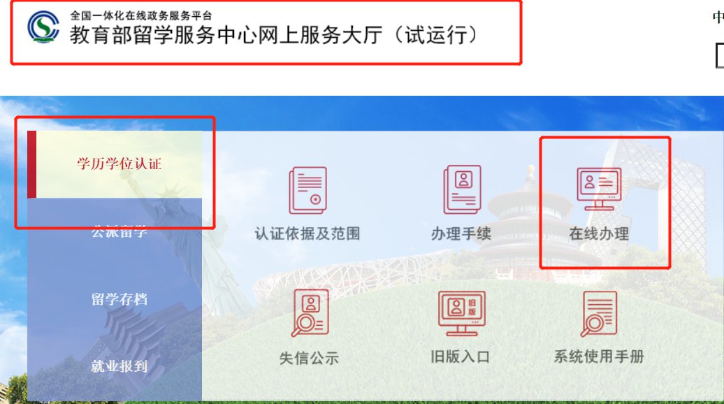 1、登录【教育部留学服务中心网上服务大厅】,点击【学历学位认证】,选择【在线办理】