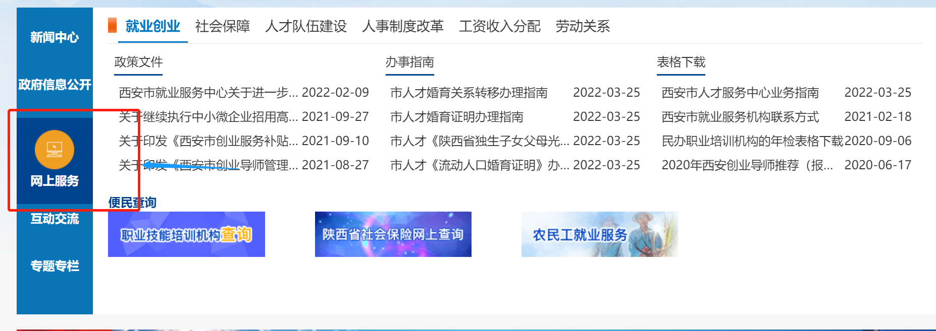 (1)登录——西安人社局,点击网上办事,进入办事大厅
