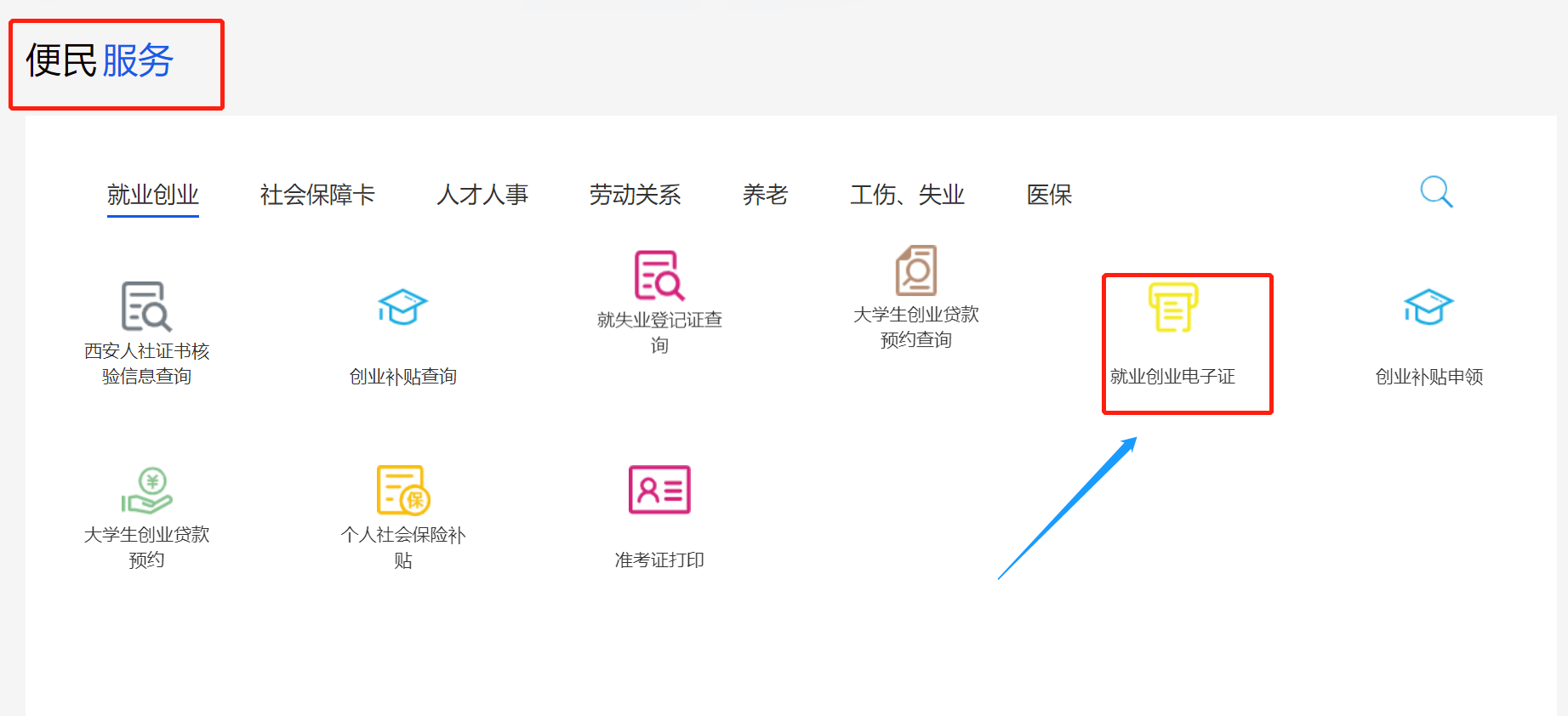 (2)在“便民服务”——“就业创业”中选择“就业创业电子证” 按要求自行下载打印。