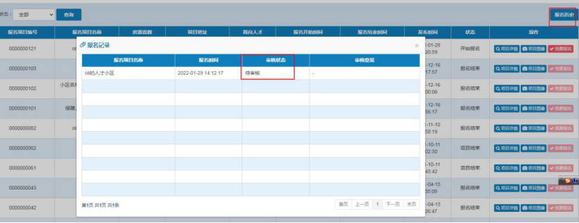 8、点击【报名历史】,可查看报名的项目的审核状态。
