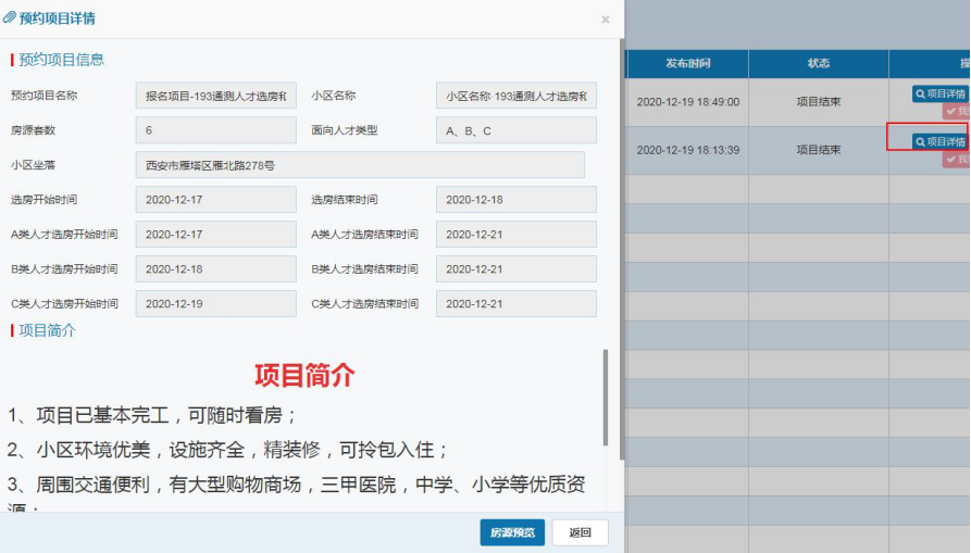 3、通过操作列的【项目详情】,可以查看项目的具体信息;