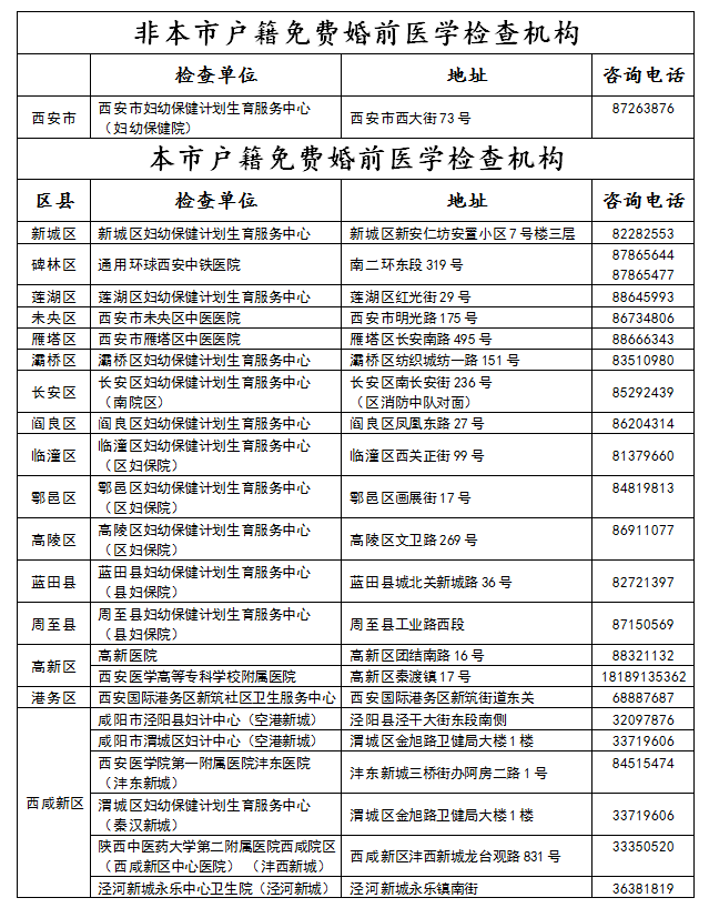 3、《西安市免费婚前医学检查告知书》(到婚姻登记部门或婚检机构领取,确认签字后到定点婚检机构进行婚检。)