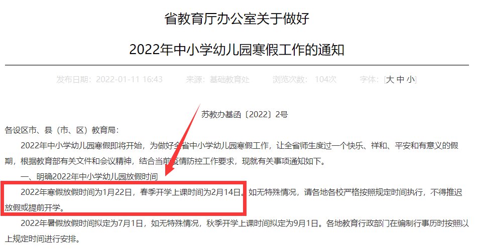 2022年江苏小学寒假放假时间:2022年1月22日;