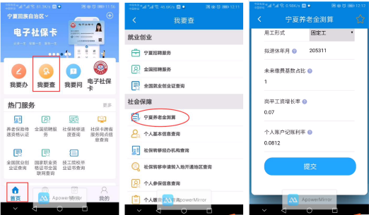 打开并登录“掌上 12333”APP 到“首页”>“我要查”>“宁夏养老金测算”>“提交”。