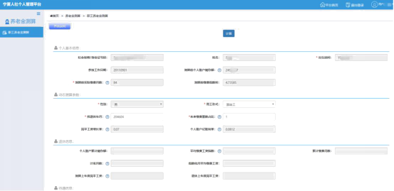 第二步:点击“养老金测算”进入,点击进入。目前只开通了职工和居民的养老测算,机关事业人员的养老测算暂时未开通。界面截图如下: