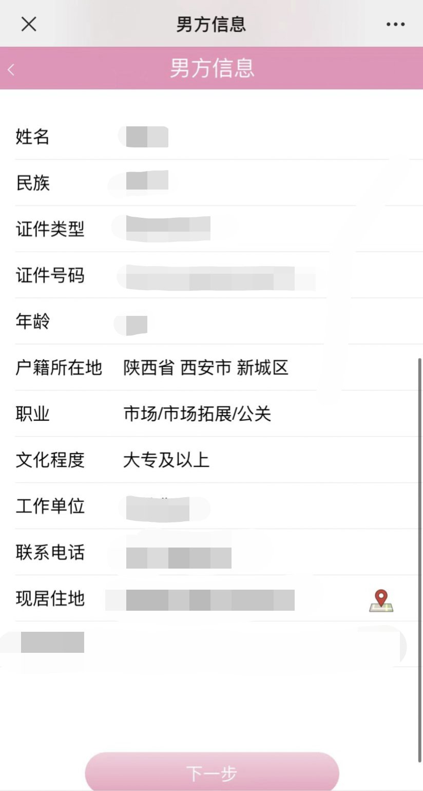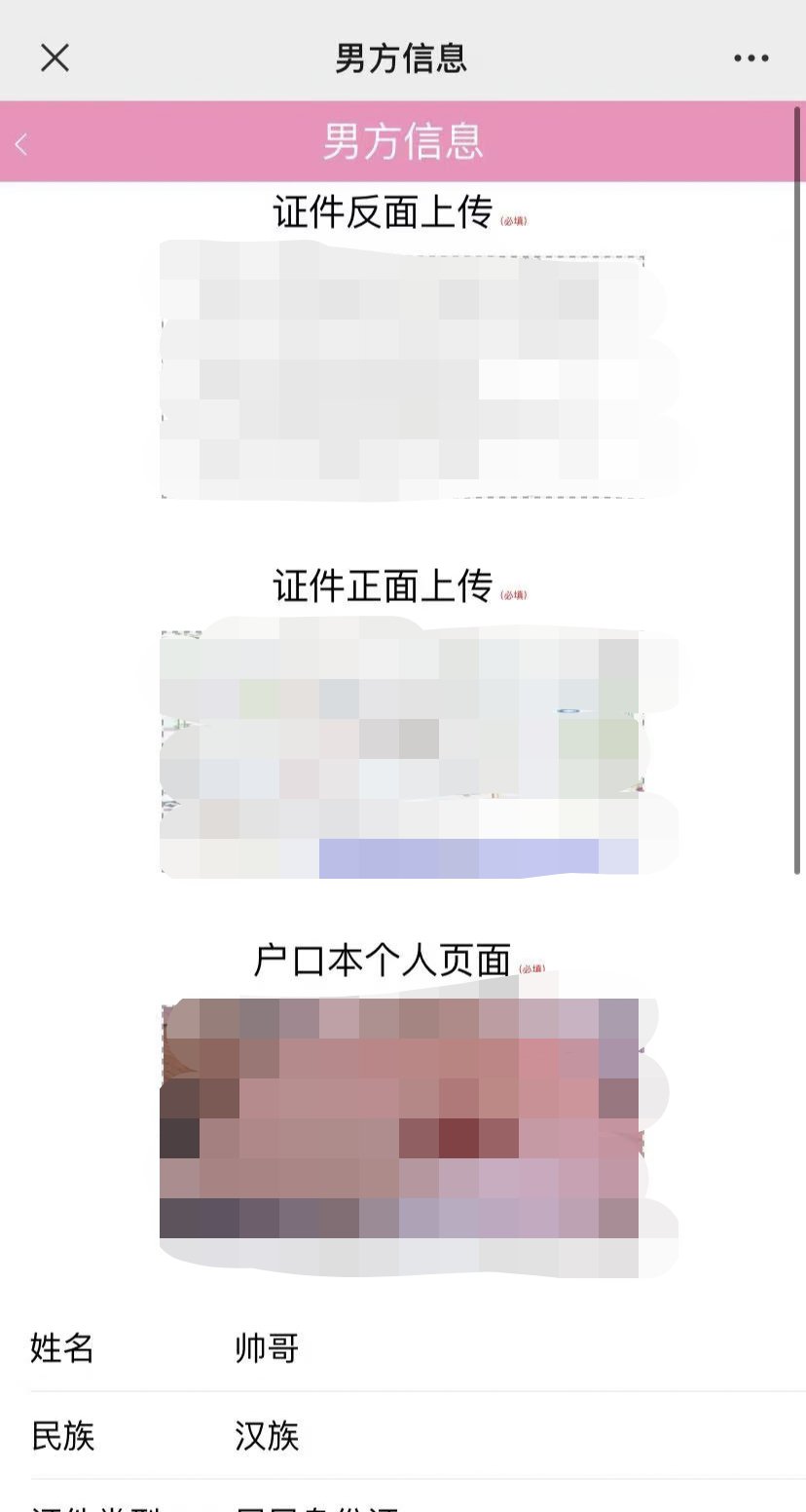 3、上传男女双方身份证正反面,输入双方姓名、户籍所在地等信息;