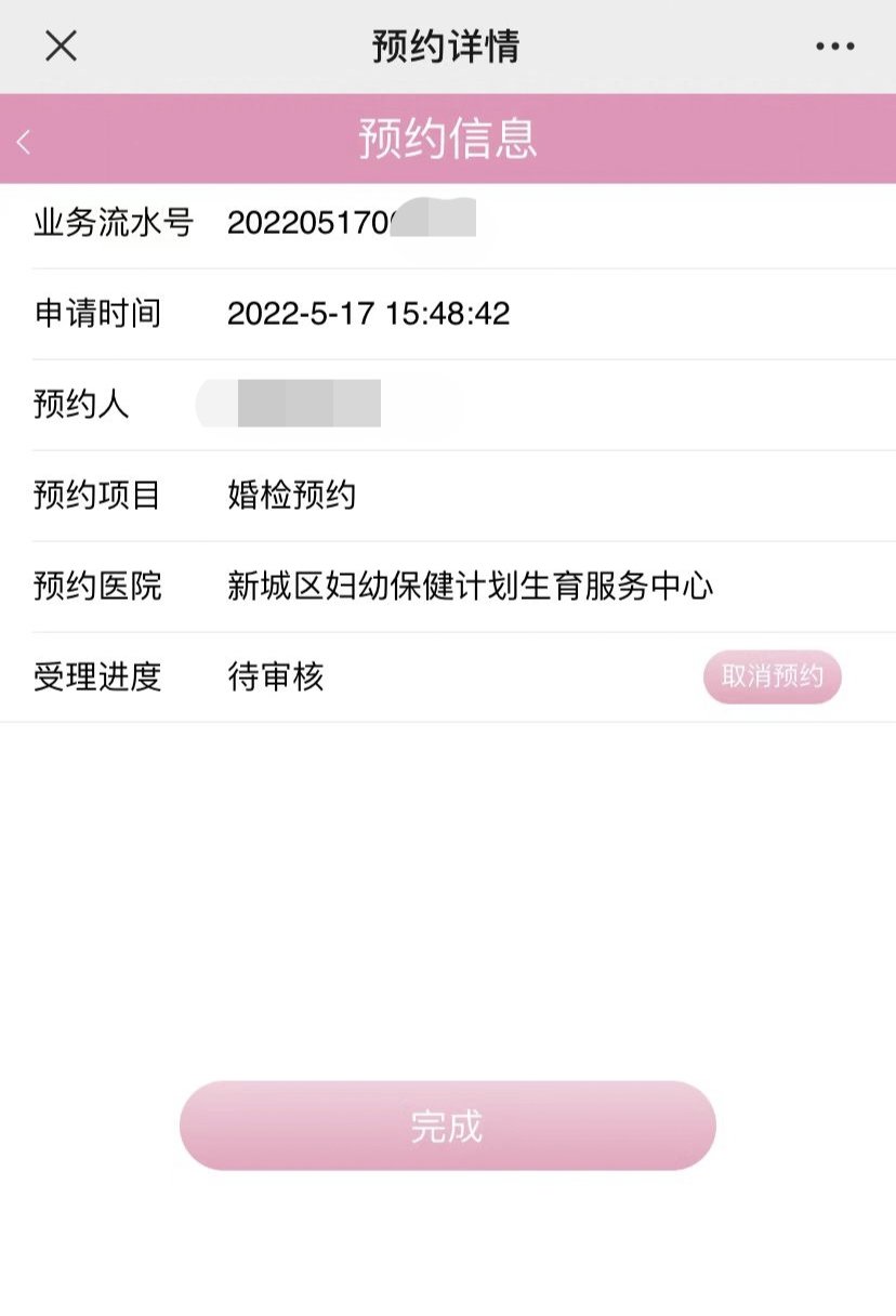 温馨提示:预约成功后会收到短信提示,请根据短信提供的时间前往婚检机构检查。