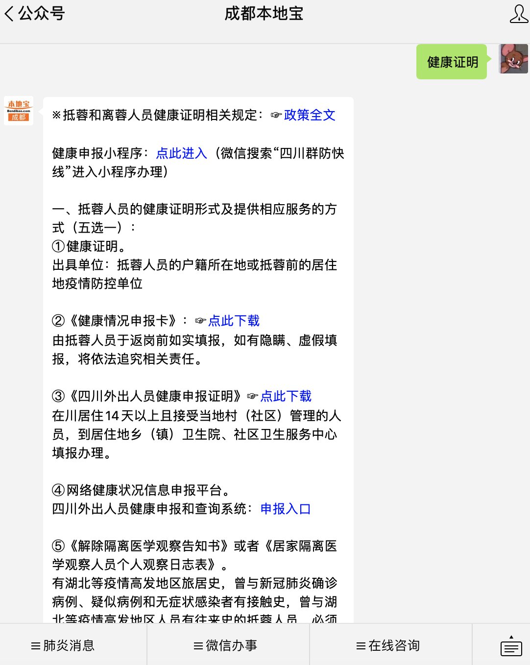 (2)《健康情况申报卡》。可通过健康成都官微和成都市卫生健康委员会官网(http://cdwjw.chengdu.gov.cn)下载后填写、自行打印。