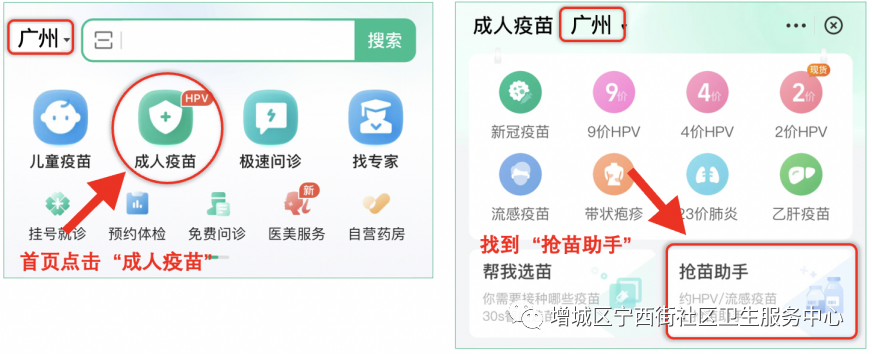 2、下载后,选择“广州”地区,点击 “成人疫苗” ,点击“抢苗助手”。