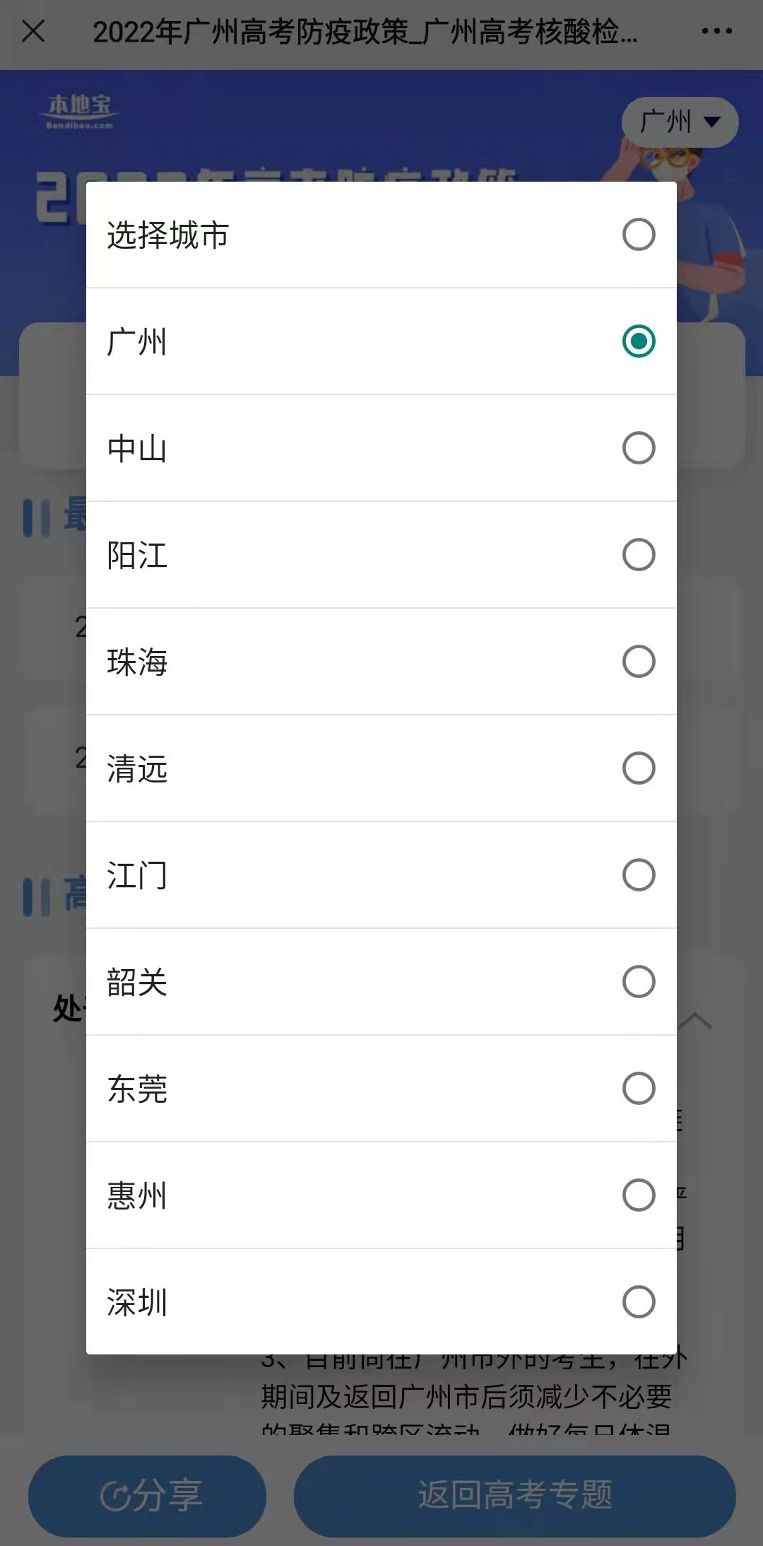 第三步:选择好所在省及市,即可获取2022年所在地高考防疫政策,如图所示: