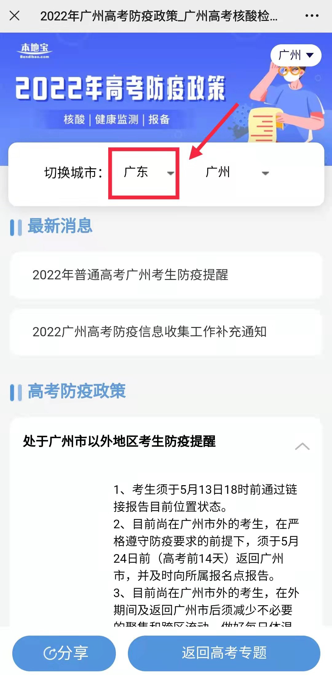 举个例子:以广东广州高考防疫政策查询为例。