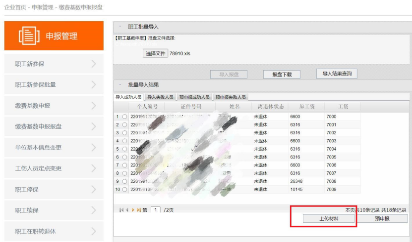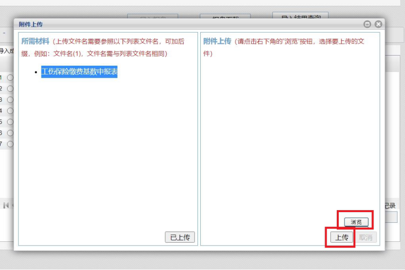 提示:点击右下角【上传材料】,上传《工伤保险缴费基数申报表》,上传文件名称要修改成列表文件名称,即:“工伤保险缴费基数申报表”,并确保信息准确。