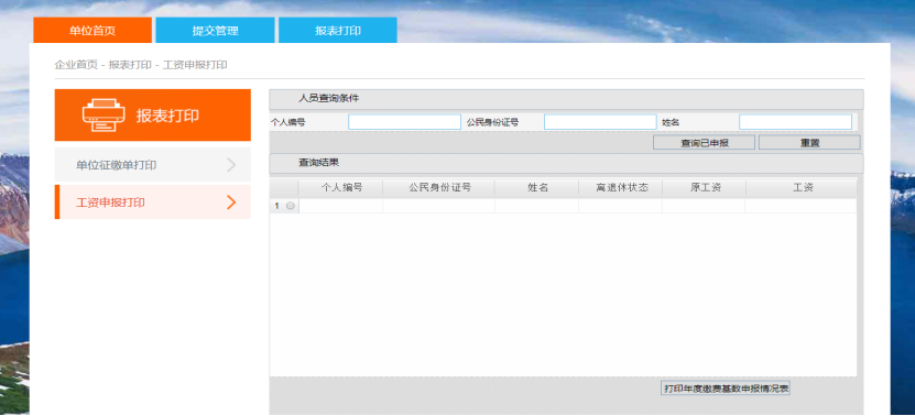 11.进入-报表打印-工资申报打印-显示如下界面。