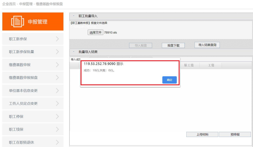 提示:点击左上角【选择文件】按钮,选择刚才做好的缴费基数申报报盘,点击【导入报盘】,出现界面如图6.1所示,点击【导入结果查询】,出现提示界面如图6.2所示,点击确定后出现界面如图6.3所示。