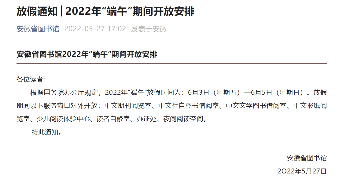 根据国务院办公厅规定,2022年“端午”放假时间为:6月3日(星期五)—6月5日(星期日)。放假期间以下服务窗口对外开放:中文期刊阅览室、中文社自图书借阅室、中文文学图书借阅室、中文报纸阅览室、少儿阅读体验中心、读者自修室、办证处、夜间阅读空间。
