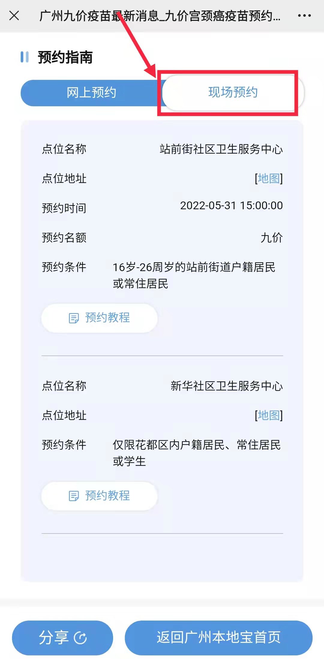 第二步:可以获取广州社区HPV疫苗网上预约最新消息或现场预约最新消息,如下图所示: