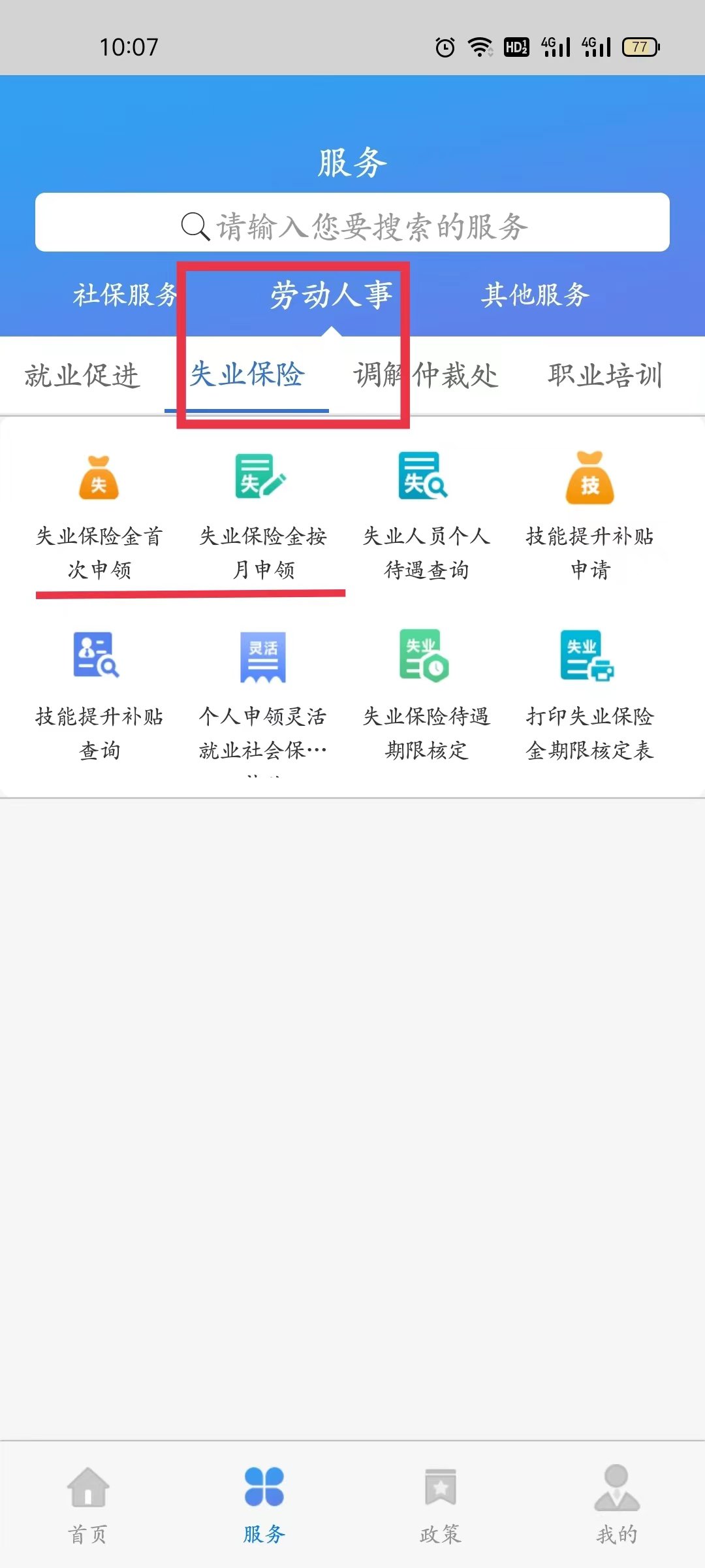 3、选择“劳动人事”——“失业保险”