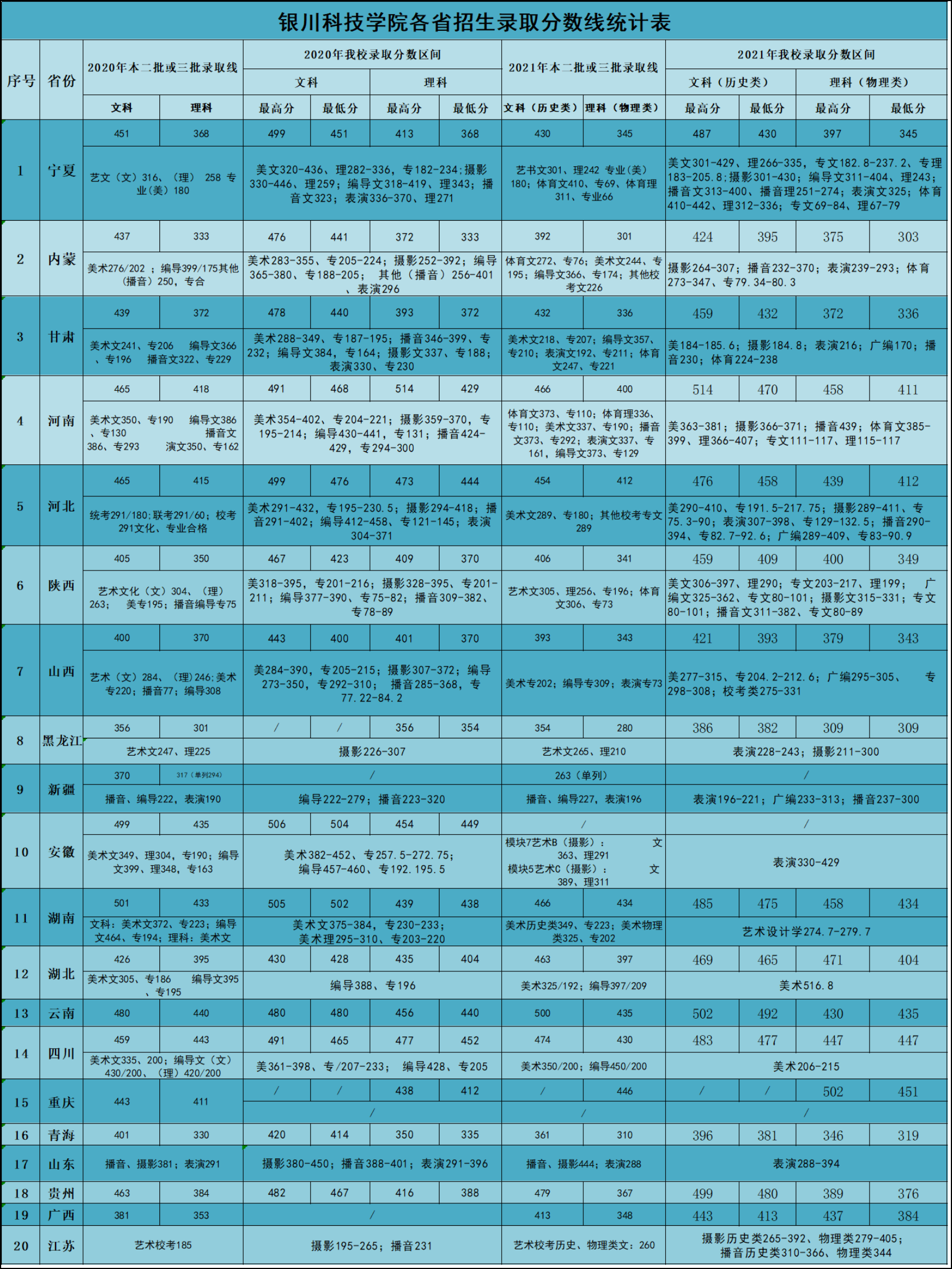 银川科技学院各省招生录取分数线统计表 (2020年-2021年)