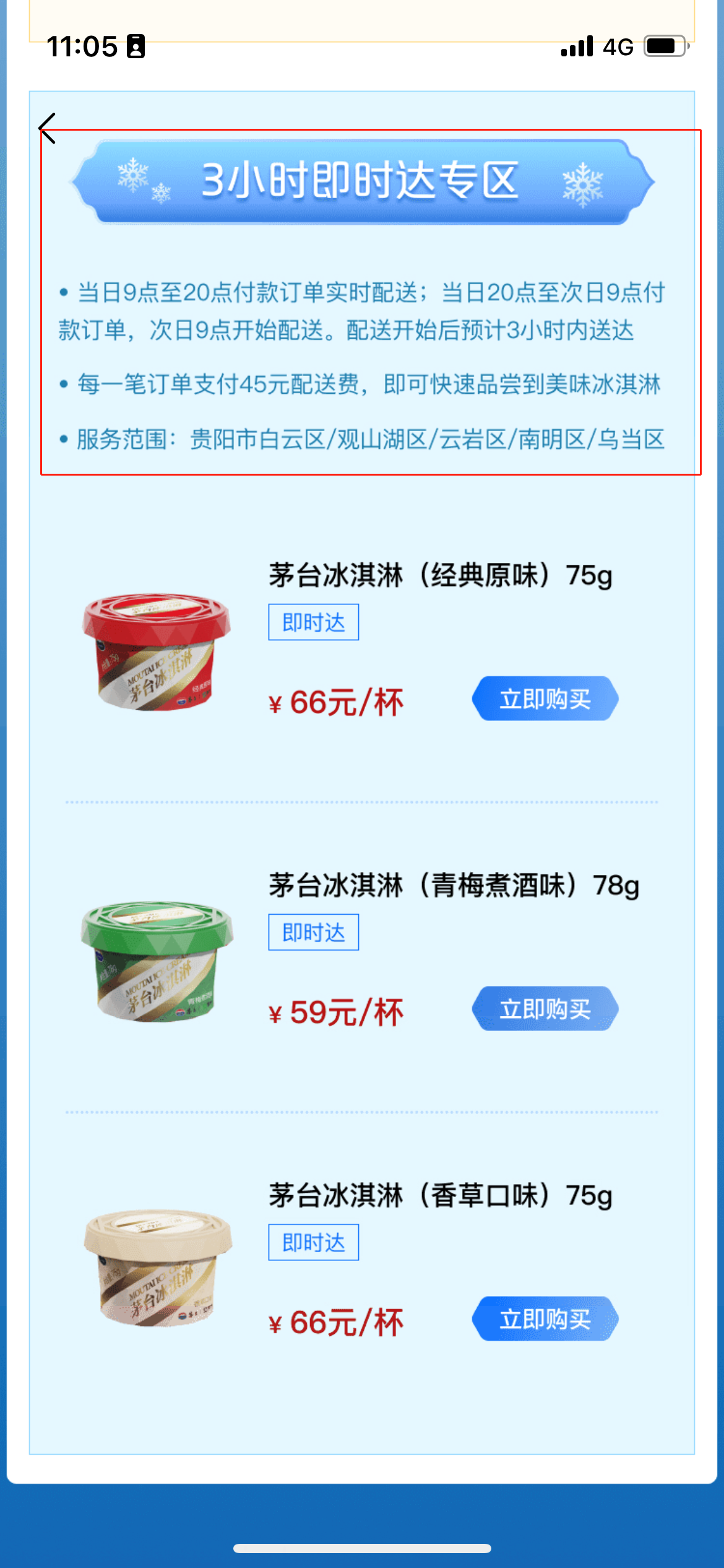 6.茅台冰淇淋在线购买分为【顺丰冷链配送专区】【3小时即时达专区】,根据自己的需求选择,点击【立即购买】,再填写地址等信息后下单即可