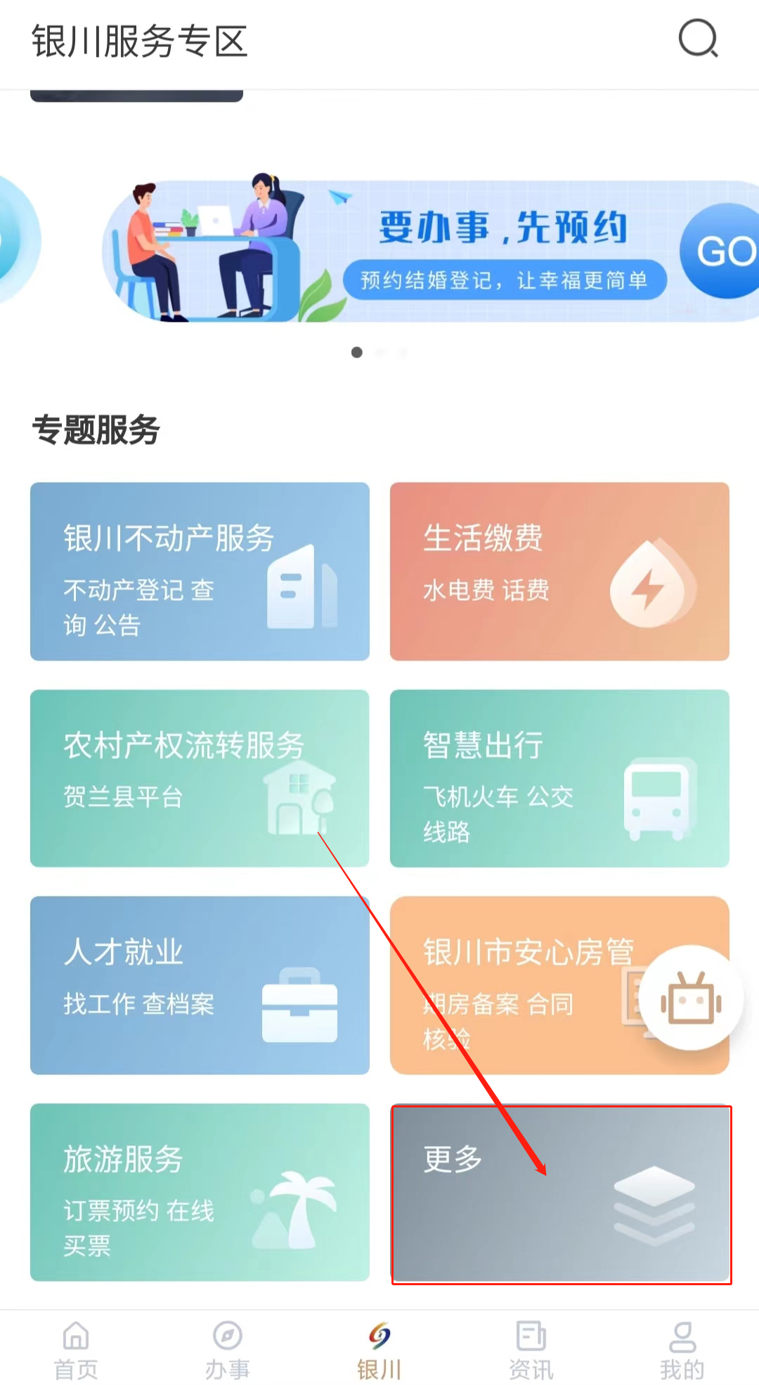 步骤三:在“专题服务中”查看全部服务,便可看到银川市住房保障资格申请功能。