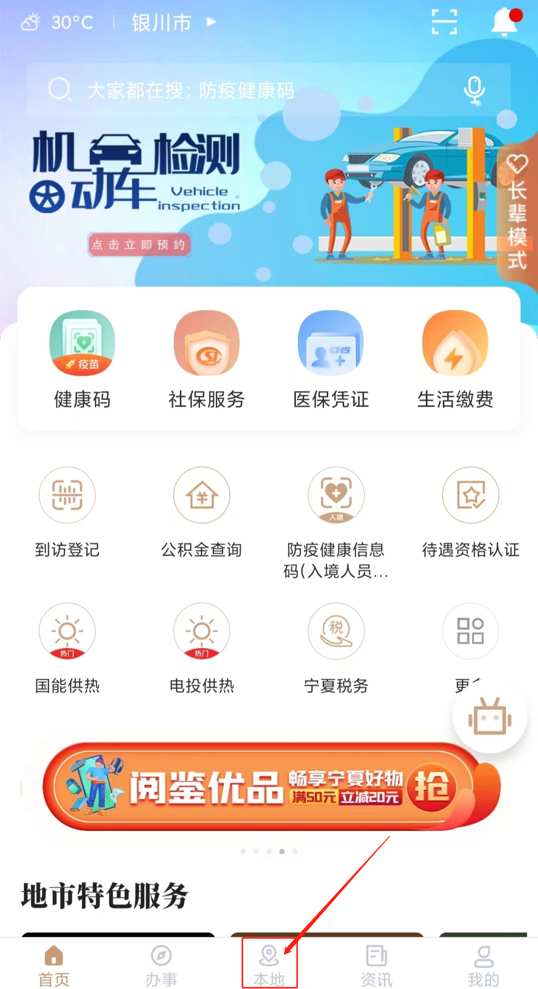 步骤一:打开“我的宁夏”APP,点击下方菜单栏“本地”