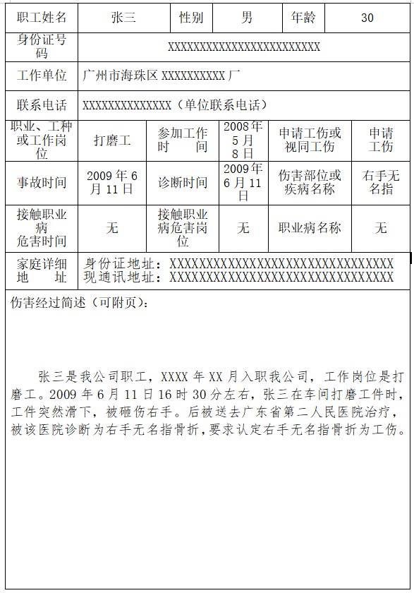 7、受伤害经过简述,应写清事故时间、地点,当时所从事的工作,受伤害的原因以及伤害部位和程度。