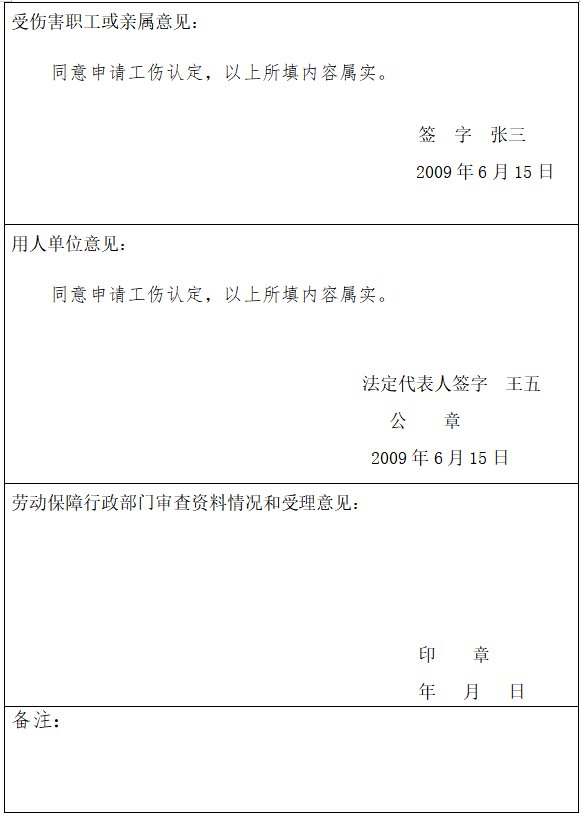 《工伤认定申请表》须由当事人或其亲属亲笔签名、盖手指模,用人单位按要求加具意见并加盖具有独立法人资格的单位公章(原件)并如实填写。