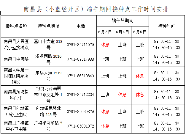 ➤南昌县(小蓝经开区)端午假期期间新冠疫苗接种点工作时间调整公告: