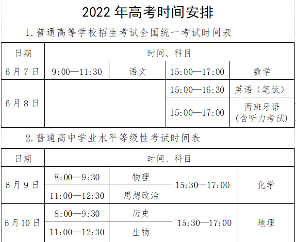 2022年北京高考共计4天。6月7-8日为统一高考,考试科目为语文、数学、外语3门,每科满分150分;6月9-10日为高中学业水平等级性考试,考试科目为思想政治、历史、地理、物理、化学、生物6门,由考生自主选择3门参加考试。